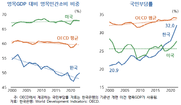 As shown in the image above, the blue line representing South Korea’s nominal private consumption as a proportion of nominal GDP reveals a continuous annual decline. This contrasts sharply with the United States (top line) and the OECD average (middle line), which maintain relatively stable levels.